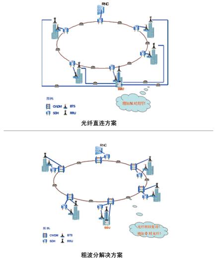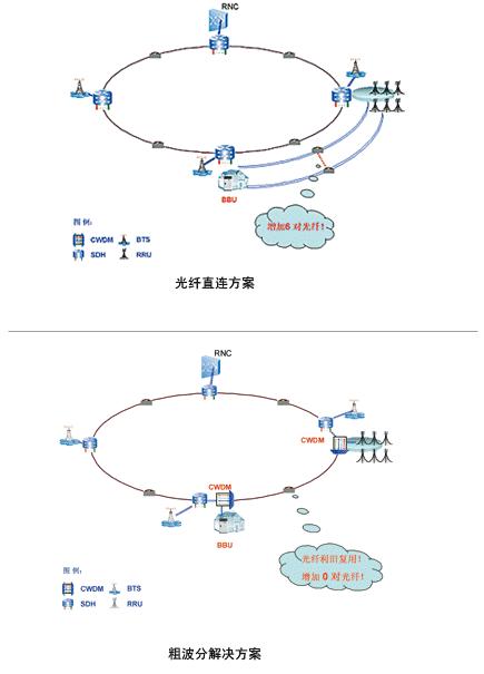 圖1 CN傳輸網(wǎng)引入WDM 2.基站光纖拉遠傳輸方案探討 中興通訊在TD-SCDMA基站技術(shù)上領(lǐng)先于業(yè)界,采用第二代分布式TD基站(BBU+RRU)技術(shù),率先在青島現(xiàn)網(wǎng)應(yīng)用。BBU和RRU之間通過光信號通信,相比傳統(tǒng)的大量電纜饋線到塔頂?shù)姆绞骄邆湟韵聝蓚優(yōu)點: (1)解決了線纜復(fù)雜、施工難度大的問題; (2)BBU和RRU分離,組網(wǎng)靈活方便,解決了機房、電源等多種難題。 通常BBU和RRU間采用光纖直連承載,然而經(jīng)過分析,在BBU:RRU為1:N的應(yīng)用場景下,用粗波分設(shè)備組網(wǎng),以波長替代裸光纖將節(jié)省大量光纖資源,對2G網(wǎng)絡(luò)中已鋪設(shè)的光纖實現(xiàn)利舊復(fù)用,使網(wǎng)絡(luò)具有良好的擴展性。此外,避免了在密集城區(qū)鋪設(shè)新光纜,保證網(wǎng)絡(luò)快速建設(shè)。圖2和圖3分別顯示了在宏基站、微基站應(yīng)用環(huán)境中,光纖直連及粗波分方案的應(yīng)用效果對比。