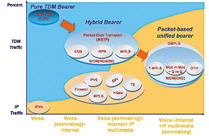 圖3 微基站“BBU+ RRU”通信環(huán)境下應(yīng)用效果對比 綜上所述,TD配套傳輸網(wǎng)絡(luò)主要采用MSTP技術(shù),實現(xiàn)對TDM及數(shù)據(jù)業(yè)務(wù)的接入、處理、調(diào)度,核心層及RRU-BBU間適度引入WDM,實現(xiàn)大顆粒數(shù)據(jù)業(yè)務(wù)的高效傳送與調(diào)度,節(jié)省光纖資源。該方案既能滿足TD當(dāng)前的建設(shè)需求,也能適應(yīng)TD中遠期的動態(tài)發(fā)展。 二、TD傳輸網(wǎng)建設(shè)方式探討 現(xiàn)有傳輸網(wǎng)是否已滿足TD網(wǎng)絡(luò)建設(shè)需求?是否需重新規(guī)劃建設(shè)傳輸網(wǎng)絡(luò)?這是網(wǎng)絡(luò)規(guī)劃實施者必須考慮的問題。下面將對現(xiàn)網(wǎng)與所需TD配套傳輸網(wǎng)絡(luò)進行比較: 從站點部署角度看,受覆蓋能力及規(guī)劃方式的限制,部分TD基站與2G基站不同址; 密集商業(yè)區(qū)、奧運場館大多采用的“BBU+RRU”分布式基站方式將導(dǎo)致帶寬需求急劇增長,現(xiàn)有網(wǎng)絡(luò)部分區(qū)域接近飽和,剩余帶寬難以支撐TD網(wǎng)絡(luò)的新增業(yè)務(wù)需求。此外,由于幾年來2G、大客戶等業(yè)務(wù)劇增及業(yè)務(wù)的突發(fā)性和不平衡性,部分區(qū)域網(wǎng)絡(luò)雖具有較大的容量,但在全網(wǎng)調(diào)度方面出現(xiàn)“瓶頸”,網(wǎng)絡(luò)資源利用率低、網(wǎng)絡(luò)業(yè)務(wù)不夠安全等問題也日益突出; 早期傳輸網(wǎng)絡(luò)主要提供2M通路業(yè)務(wù),接口速率低、種類單一,中低端設(shè)備不具備容量平滑升級能力,數(shù)據(jù)類業(yè)務(wù)處理能力較差,尤其是大顆粒數(shù)據(jù)業(yè)務(wù)的承載效率低; TD網(wǎng)絡(luò)目前仍處于試驗性質(zhì),距離大規(guī)模商用尚有一段距離,TD網(wǎng)絡(luò)持續(xù)的技術(shù)演進、基站站型升級、規(guī)劃調(diào)整等將給現(xiàn)有網(wǎng)絡(luò)帶來振蕩,對現(xiàn)有2G業(yè)務(wù)、大客戶業(yè)務(wù)等有不利影響。 結(jié)合TD網(wǎng)絡(luò)站點規(guī)劃及TD技術(shù)發(fā)展預(yù)測等各方面情況,建議規(guī)劃獨立的TD配套傳輸網(wǎng)絡(luò),以新建網(wǎng)絡(luò)為主,適度引入波分技術(shù)。 三、TD傳輸網(wǎng)遠期發(fā)展趨勢 近年來,通信行業(yè)中數(shù)據(jù)業(yè)務(wù)迅猛發(fā)展,業(yè)務(wù)IP化已成大勢所趨,數(shù)據(jù)多媒體業(yè)務(wù)尤其是語音、視頻IP化取得了重大進展,導(dǎo)致了傳輸網(wǎng)承載信號從TDM到IP的逐漸轉(zhuǎn)變。 當(dāng)前,技術(shù)成熟、應(yīng)用廣泛的MSTP技術(shù)強調(diào)依托于SDH平臺。MSTP利用SDH網(wǎng)絡(luò)的多余電路(時隙)資源,實現(xiàn)對數(shù)據(jù)業(yè)務(wù)尤其是以太網(wǎng)業(yè)務(wù)的透明傳送,在此基礎(chǔ)上逐步實現(xiàn)了功能的深化和演進,如增加L2交換、內(nèi)嵌RPR功能以及MPLS功能等。但隨著3GIP化演進和相關(guān)技術(shù)及標(biāo)準(zhǔn)的成熟,伴隨著分組傳送技術(shù)、標(biāo)準(zhǔn)和產(chǎn)業(yè)鏈的成熟,以現(xiàn)有光纖網(wǎng)絡(luò)結(jié)構(gòu)為基礎(chǔ),建設(shè)基于分組傳送技術(shù)的城域傳送網(wǎng),并輔以大容量WDM(OXC)的傳輸骨干網(wǎng)是未來的重要發(fā)展趨勢,參見圖4。