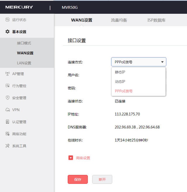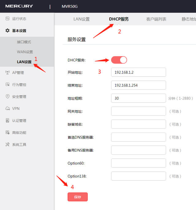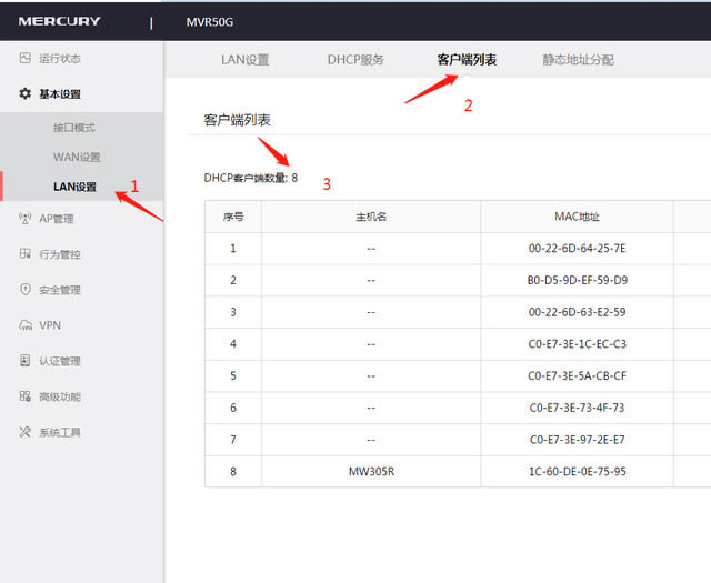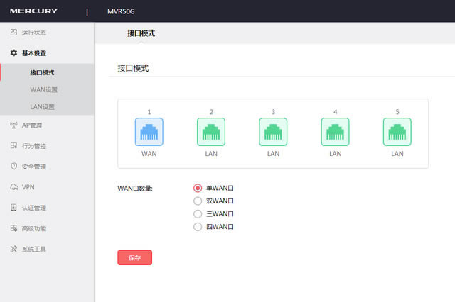 水星MVR50G全千兆多WAN口企業(yè)級(jí)路由器可同時(shí)連接4條寬帶。注:無(wú)線功能帶機(jī)量約50臺(tái),適用于中小企事業(yè)單位。此外,這種路由器也有AP管理功能,即AC管理器,但需要水星無(wú)線AP哦,其他牌不能滴。  正面圖 還支持路由器IPSec VPN、PPTP VPN和L2TP VPN等主流多協(xié)議VPN通道,遠(yuǎn)程通信快速安全。多條VPN渠道滿足分支機(jī)構(gòu)與企業(yè)總部、分支機(jī)構(gòu)、公司網(wǎng)絡(luò)與出差員工、企業(yè)與合作伙伴之間的建議VPN通道需求 一、路由器登錄。 電腦連到LAN口,或連到WAN/LAN共用口,IP設(shè)置為自動(dòng)訪問(wèn),打開(kāi)瀏覽器,輸入地址欄:【melogin.cn】,登錄路由器配置頁(yè)面,進(jìn)入后設(shè)置新的管理員密碼,設(shè)置后,記錄并記住,以后調(diào)試路由器使用此密碼!!不要忘記,不要忘記,不要忘記!!! 二、網(wǎng)絡(luò)設(shè)置。 登錄后點(diǎn)【基本設(shè)置】【接口模式】,每個(gè)端口的功能都可以設(shè)置。如果您選擇一條寬帶單條WAN口】,選擇相應(yīng)的多條寬帶WAN口數(shù),并記錄哪只寬帶貓接哪個(gè)口,以便以后調(diào)試相應(yīng)的寬帶上網(wǎng)方式。  接口設(shè)置 WAN網(wǎng)絡(luò)供應(yīng)商提供的口設(shè)置和三種上網(wǎng)方式大多是寬帶貓帶路由功能,所以這里的上網(wǎng)方式是動(dòng)態(tài)的IP】即自動(dòng)獲取方式,如果是拔號(hào)方式,選擇【PPPoE填寫正確供應(yīng)商提供的帳戶和密碼。專線一般是靜態(tài)的IP】。  設(shè)置互聯(lián)網(wǎng)模式 設(shè)置正確的證點(diǎn)保存,幾秒鐘后就會(huì)看到連接狀態(tài),如果已經(jīng)連接,就有可能正常上網(wǎng)! 如果多條寬帶同時(shí)聚集在互聯(lián)網(wǎng)上,則需要設(shè)置流量平衡: 均衡模式 連接均衡:多WAN根據(jù)總連接數(shù)合理分配給每個(gè)口WAN口,保證每一個(gè)WAN口利用率相同。平衡帶寬:多WAN接口流量比等于設(shè)定的接口帶寬比。如果接口 1 和接口 2 帶寬比為 2:1,使用帶寬平衡后,通過(guò)接口 1 和接口 2 流量比約為 2:1。按需設(shè)置  均衡設(shè)置流量 三、開(kāi)啟DHCP服務(wù)  開(kāi)啟 DHCP 四、檢查路由器下連接的設(shè)備  檢查路由下連接的設(shè)備