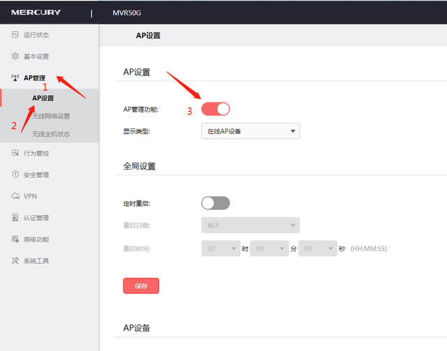 五、1、AP管理:需要連接水星的無(wú)線AP才可以哦  開(kāi)啟AP管理 2、設(shè)置AP無(wú)線名稱和密碼  AP的無(wú)線設(shè)置