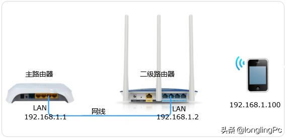這種方法需要設置副由器,第一次修改lan如果主路由器是192.168.1.1.副路由器需要修改為192.168.1.二是關閉副路由器DHCP自動分配ip避免與主路由器發生沖突。以第二種方式連接,所有設備都在同一網段,可以相互通信,副路由器只用作無線交換機。