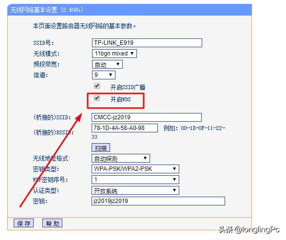 第三種連接方式 WDS橋接。 在無線設置中,副路由器被用作無線擴展器WDS功能,然后選擇橋接主路由器ssid號及無線密碼。