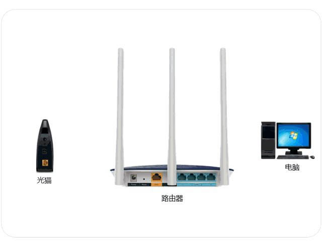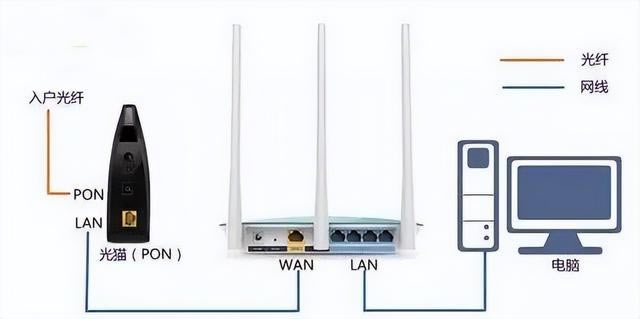 網(wǎng)絡(luò)運(yùn)營商提供的入戶線路是光纖,入戶后需要先接入光貓轉(zhuǎn)換,將網(wǎng)線從光貓連接到路由器WAN然后從路由器連接電腦:
