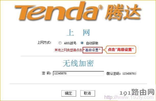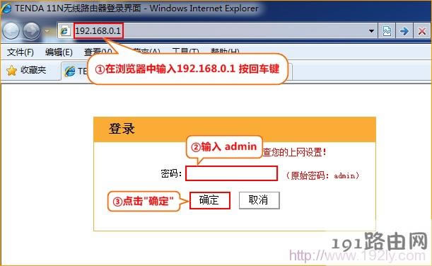 1.在瀏覽器中輸入:192.168.0.1 按回車鍵,在跳轉(zhuǎn)的頁面中輸入密碼admin ,確定即可。(如果192.168.0.1打不開,請(qǐng)閱讀文章:騰達(dá)(Tenda)無線路由器192.168.0.1打不開的解決辦法)