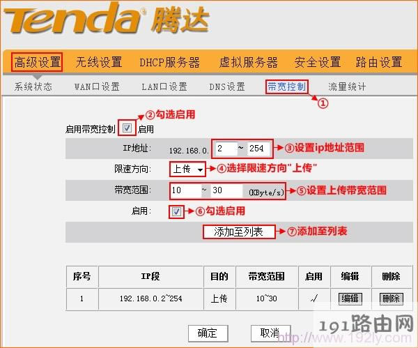 注意:如果想單獨(dú)控制一臺(tái)電腦的網(wǎng)速,只需要查看到對(duì)方的ip地址,并在騰達(dá)路由器上進(jìn)行IP和MAC地址綁定,確保對(duì)方一直使用這個(gè)Ip地址;然后在“第二步”把ip地址換成這個(gè)綁定IP地址,帶寬設(shè)置范圍可以參照我們的帶寬對(duì)照表設(shè)置。