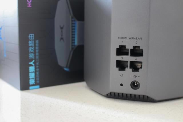 榮耀獵人游戲路由背面有4個千兆自適應網口,一個恢復出廠設置按鈕和電源插孔。支持盲插路由器的4千兆網口可根據網線上端設備自動確定WAN、LAN口。