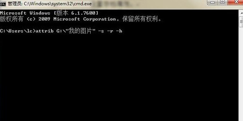 2、輸入命令:attrib G:\"我的圖片" -s -h -r