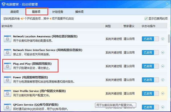 (3)接著把選項卡切換到服務項,找到Plug And Play(即插即用服務),點擊開啟即可。