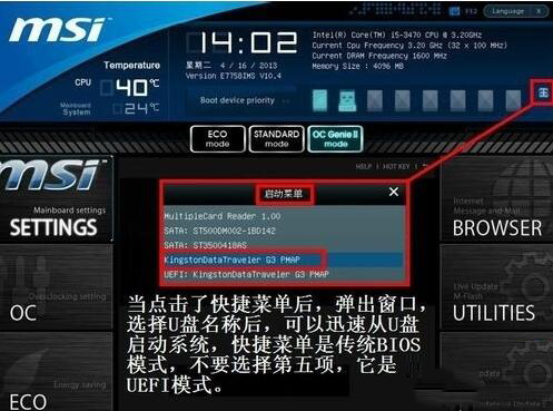 U盤,全稱USB閃存盤,英文名“USB flash disk”。 它是一種使用USB接口的無需物理驅動器的微型高容量移動存儲產品,通過USB接口與電腦連接,實現即插即用。U盤連接到電腦的USB接口后,U盤的資料可與電腦交換。而之后生產的類似技術的設備由于朗科已進行專利注冊,而不能再稱之為“優盤”,而改稱“U盤”。后來,U盤這個稱呼因其簡單易記而因而廣為人知,是移動存儲設備之一。現在市面上出現了許多支持多種端口的U盤,即三通U盤(USB電腦端口、iOS蘋果接口、安卓接口)。 筆記本電腦如何設置U盤啟動?當你決定u盤裝系統的時候,制作一個成功的u盤啟動盤是重點之一,同時也需要了解清楚設置u盤啟動盤,小伙伴千萬不要覺得bios設置u盤啟動會很難,今天快啟動小編為大家分享詳細的操作教程,一起來看看吧。 一、用快捷熱鍵設置啟動U盤方式 1.下載u盤啟動盤制作工具,將制作好的U盤插入電腦USB接口,待開機畫面顯示時,按快捷啟動鍵,這里以微星為例,按F11。 2.接著就會出現啟動選擇菜單,這里我們可以看到U盤的名稱,上下移動光標選擇它,然后按回車,即可進入啟動U盤。如果這里是光盤啟動,看到的則是光驅的名稱,選擇光驅,按回測,同樣可以進入光盤啟動。如下圖所示