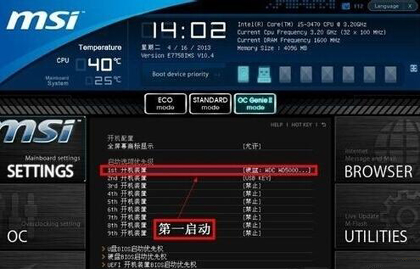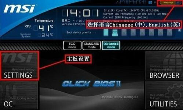![]() 三、設置UEFI啟動U盤 1.開機按Del進入UEFI BIOS界面,點擊右上角的Language(語言),選擇“Chinaese(中文)”,然后選擇“SETTINGS(主板設置)”。如下圖所示