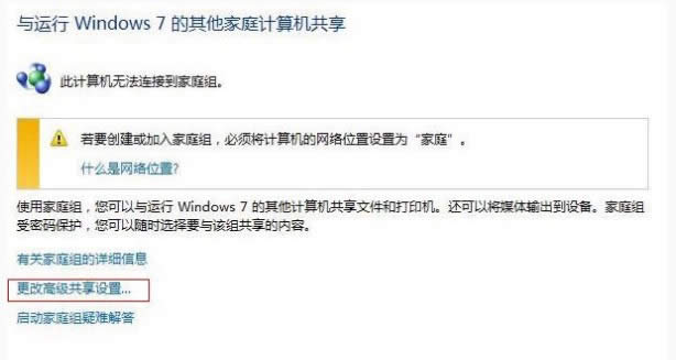 Windows 7,中文名稱視窗7,是由微軟公司(Microsoft)開發的操作系統,內核版本號為Windows NT 6.1。Windows 7可供家庭及商業工作環境:筆記本電腦 、平板電腦 、多媒體中心等使用。Windows 7可供選擇的版本有:入門版(Starter)、家庭普通版(Home Basic)、家庭高級版(Home Premium)、專業版(Professional)、企業版(Enterprise)(非零售)、旗艦版(Ultimate)。 很多朋友在進行win7局域網訪問共享,抱怨提示權限限制提示,那訪問windows7局域網為什么會出現權限限制提示?應該怎么解決win7局域網資源共享訪問權限設置呢,今天技術員聯盟windows7系統局域網訪問權限設置技巧教程給大家講解一下吧。 打開“控制面板”下的“家庭組” 點擊“更改高級共享設置”