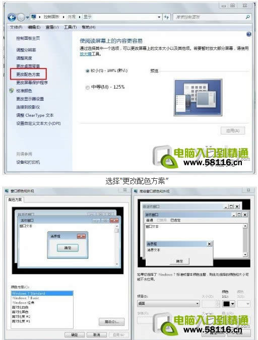 想要更改Win7默認字體,首先要在控制面板的“外觀”中找到“顯示”一項,選擇左側(cè)的“更改配色方案”,點擊進入窗口顏色和外觀對話框,再點擊“高級”按鈕,在接下來的界面中,我們就可以選擇自己喜歡的系統(tǒng)顯示字體了。
