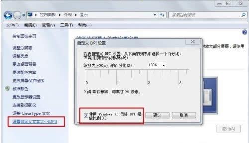 另外,由于Win 7的Aero中提供的文字渲染效果,文字的周圍會比較模糊,沒有XP中棱角分明的感覺,如果你對這一點很在意,也可以通過操作來緩解這個問題。同樣是在“顯示”窗口中,單擊窗口左側(cè)的“設(shè)置自定義文本大小” ,在打開的窗口中,勾選“使用Windows XP風(fēng)格DPI縮放比例”,單擊“確定”,就可以完成這一設(shè)置。