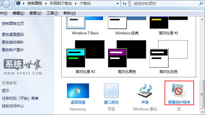 個性化設置 二、點擊win7系統個性化后,就會彈出一個窗口,如下圖顯示,我們再點擊底部 的“屏幕保護程序”如下示意圖所示: