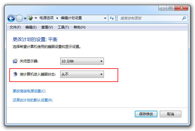 我們將“是計算機進入睡眠狀態”后面的兩項全部設置為“從不”,完成后點擊底部的“保存修改”這樣你的win7系統就不會再自動休眠了了。 怎么樣?經過簡單的設置后,半夜掛機下載愛情動作片也行了,掛著游戲去上班也行了。 windows 7 的設計主要圍繞五個重點——針對筆記本電腦的特有設計;基于應用服務的設計;用戶的個性化;視聽娛樂的優化;用戶易用性的新引擎。 跳躍列表,系統故障快速修復等,這些新功能令Windows 7成為最易用的Windows。 |