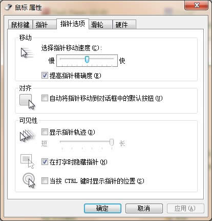 3、調(diào)整移動速度彈出對話框,切換到“指針選項”選項卡。在"移動”選項區(qū)內(nèi) 拖動調(diào)節(jié)滑塊到合適位罝。場單擊"確定"按 鈕即可。