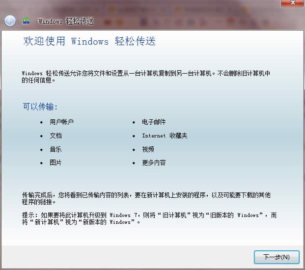 1.如果是Win7系統之間的傳送,我們只要點擊Win7桌面左下角的圓圓開始按鈕,從搜索框中輸入“傳送”,就可以快速找到“Windows 輕松傳送”這個功能。 2.從“Windows輕松傳送”的面板中可以看出,Win7傳送的內容非常豐富,包括賬號信息,郵件設置、聯系人,微軟Office軟件等程序的各種設置;用戶賬戶和設置,主 題設置(包括桌面背景、顏色、聲音等)、網絡連接、屏幕保護程序、字體、“開始”菜單選項、任務欄選項和網絡打印機、Internet設置等,還包括“個 人文件夾”里的幾乎所有文件,比如“我的文檔”、“我的圖片”、“我的音樂”、“我的視頻”、“收藏夾”等等。 3.點擊“下一步”,我們可以看到傳送項目的選擇。三個選項,如果兩臺電腦已經用網線相連,可以選擇“輕松傳送電纜”,如果是通過局域網傳送就選擇“網絡”,如果是只有一臺電腦,則選擇“外部硬盤或USB閃存驅動器”。 4.選擇好傳送項目后,進入下一步。注意!這里比較關鍵。一定要清楚傳送方向。如果是需要做備份操作,一定選擇“這是我的舊計算機”,如果是準備將備份的設置傳送到新的計算機,選擇“這是我的新計算機。 windows 7 的設計主要圍繞五個重點——針對筆記本電腦的特有設計;基于應用服務的設計;用戶的個性化;視聽娛樂的優化;用戶易用性的新引擎。 跳躍列表,系統故障快速修復等,這些新功能令Windows 7成為最易用的Windows。 |