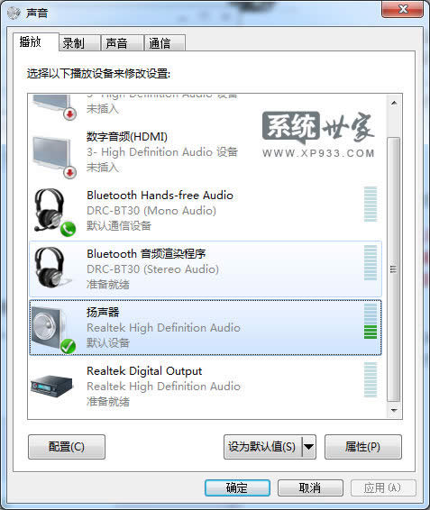 Win7 32位系統(tǒng)雙聲卡怎么切換,小女友不肯獨(dú)自看她的電影,非得粘著你,可是會(huì)影響你的游戲了,怎么辦呢?我們可以使用多屏顯示的時(shí)候,一個(gè)玩游戲一個(gè)看電影,然后怎么把游戲聲音和電影分開(kāi)輸出的話,我們現(xiàn)在使用雙聲卡來(lái)完成這個(gè)功能。一般的主板都會(huì)帶個(gè)板載聲卡,然后可以自己加個(gè)PCI或USB的獨(dú)立聲卡,當(dāng)然也可以使用藍(lán)牙音頻渲染當(dāng)?shù)诙䝼(gè)聲卡。這里用藍(lán)牙耳機(jī)當(dāng)?shù)诙䝼(gè)音頻輸出,音箱播放游戲和其他電腦聲音,藍(lán)牙耳機(jī)播放電影聲音。