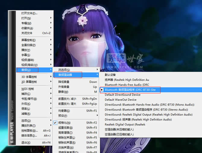 以KMPlayer為例(其他可以設(shè)置音頻輸出的也類似),打開(kāi)播放器,右鍵選擇 音頻-> 音頻渲染器 -> Bluetooth音頻渲染程序。