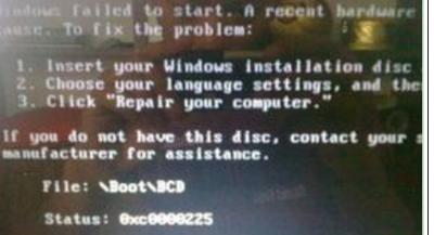 | Windows 7,中文名稱視窗7,是由微軟公司(Microsoft)開發(fā)的操作系統(tǒng),內(nèi)核版本號為Windows NT 6.1。Windows 7可供家庭及商業(yè)工作環(huán)境:筆記本電腦 、平板電腦 、多媒體中心等使用。Windows 7可供選擇的版本有:入門版(Starter)、家庭普通版(Home Basic)、家庭高級版(Home Premium)、專業(yè)版(Professional)、企業(yè)版(Enterprise)(非零售)、旗艦版(Ultimate)。 最近有用戶在開啟win7系統(tǒng)過程中,突然藍(lán)屏,錯誤代碼OXC0000225的問題,其實此問題一般都是由系統(tǒng)軟件、內(nèi)存或者硬盤引起的,現(xiàn)小編介紹win7系統(tǒng)開機(jī)藍(lán)屏錯誤OXC0000225的排查方案,具體如下: