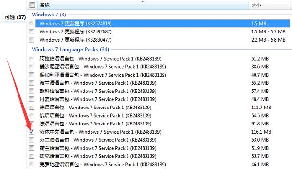 在窗口中點(diǎn)擊“34個(gè)可選更新”鏈接,在可以下載安裝的語言包列表中選擇“繁體中文語言包”,確定即可。