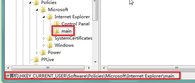 2、在打開(kāi)的注冊(cè)表編輯器窗口中,依次展開(kāi)以下注冊(cè)項(xiàng)HKEY_CURRENT_USER\software\policies\Microsoft\Internet explorer\main。