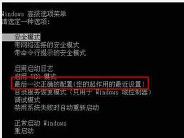1、重啟Win7系統,按住F8鍵,進入“系統高級選項菜單”后,選擇“最后一次正確配置”。