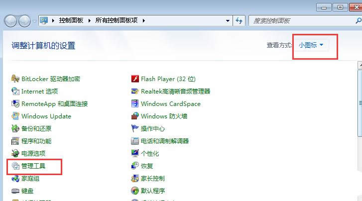 1、在win7系統(tǒng)桌面開始菜單中,打開控制面板,接在控制面板中,將查看方式修改為小圖標后在其界面中找到“管理工具”的選項;