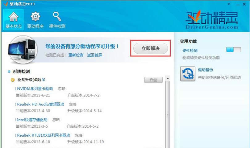 2、驅(qū)動(dòng)精靈會(huì)檢測后電腦中有哪些硬件的驅(qū)動(dòng)不是最新版本,需要升級(jí),點(diǎn)擊“立即解決”按鈕;