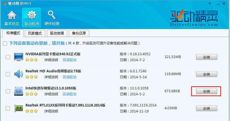3、在升級(jí)驅(qū)動(dòng)的列表中,選擇需要安裝的硬件驅(qū)動(dòng),點(diǎn)擊安裝,在線下載新驅(qū)動(dòng)。