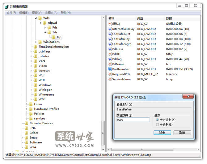 第五步 完成上面的數值修改操作后,我們接著再將鼠標定位于另一個注冊表分支數值。 [HKEY_LOCAL_MACHINE\SYSTEM\CurrentControlSet\Control\Terminal Server\WinStations\RDP-Tcp] 第六步 在RDP-Tcp子鍵所對應的右側顯示區域中,我們同樣會看到一個名為PortNumber的子鍵,把該子鍵的數值也要一并修改過來,例如這里我們也要將它的數值修改成“9999”;