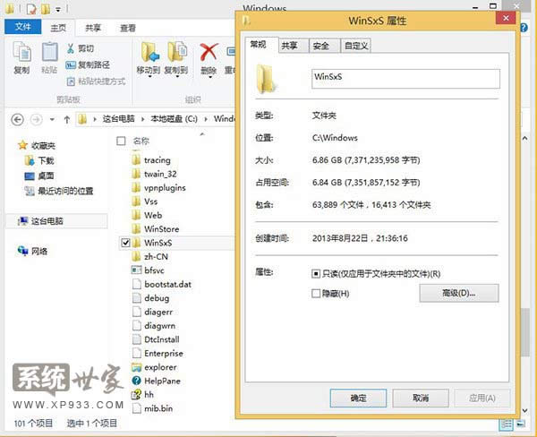 | Windows 7,中文名稱視窗7,是由微軟公司(Microsoft)開發的操作系統,內核版本號為Windows NT 6.1。Windows 7可供家庭及商業工作環境:筆記本電腦 、平板電腦 、多媒體中心等使用。Windows 7可供選擇的版本有:入門版(Starter)、家庭普通版(Home Basic)、家庭高級版(Home Premium)、專業版(Professional)、企業版(Enterprise)(非零售)、旗艦版(Ultimate)。 今天番茄花園查看Win7系統/Win8.1系統 WinSxS文件夾實際大小教程告訴大家。談到Win7系統/Win8.1冗余,不得不提到這個WinSxS特殊文件夾。該文件夾位于C:\Windows目錄路徑下,里面存儲大量系統系統備份、更新補丁備份。隨著時間的推移,WinSxS也成為系統盤最大的文件夾。 對于普通用戶來說,最關心的是WinSxS文件夾為何持續變大?實際上,WinSxS文件夾具體功能為組件存儲,里面存儲了Windows重要組件功能,例如大家熟悉的C:\Windows\system32目錄。 而WinSxS文件夾自身與C:\Windows\system32目錄創建了硬鏈接,因此,我們很難在資源管理器直接查看實際大小,參考下圖: