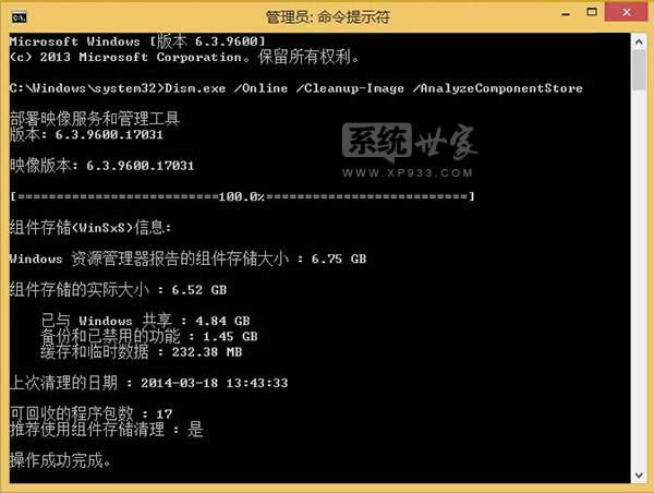 2、在打開的命令提示符中輸入如下查詢命令: Dism.exe /Online /Cleanup-Image /AnalyzeComponentStore //查詢當前WinSxS文件夾實際大小