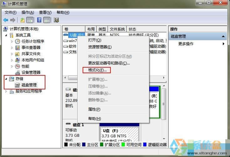 2、打開計算機管理界面后,選擇存儲工具下的“磁盤管理”選項,在中間的信息窗口中找到自己的u盤,鼠標右鍵點擊u盤,選擇“格式化”,如下圖所示: