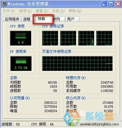 如果下次開機還有這類情況,我們就要看看我們系統是不是中毒或裝了什么流氓軟件導致系統變慢,資源占用較多了。我們處理電腦的問題一定要“先軟后硬”。 我們可以同時按鍵盤上的CTRL+ALT+DEL,調出WINDOWS任務管理器,查看一下CPU的占用情況及內存占用情況。 調出任務管理器后,我們點性能,可以查看CPU,內存的資源占用情況。