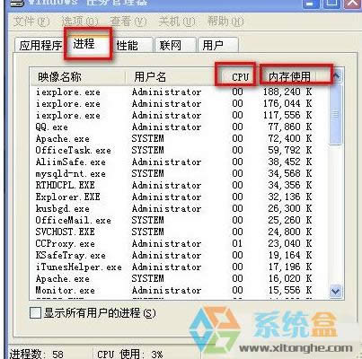 如果CPU占用經常百分之百或內存占用達到百分之7,8十的話,一定是中毒了,這時我們就要全盤殺毒或重裝系統。 我們再點進程欄,查看什么程序占用資源最多,我們可以點CPU和內存使用,進行排序來進行查找。