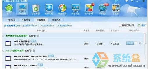 打開金山衛士,在系統優化-開機加速里可以對一些無關緊要的程序進行啟動禁止。
