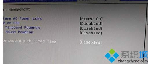 4、用鍵盤上的上下左右鍵控制選項(xiàng),選擇POWER MANAGEMENT主選項(xiàng),在主選項(xiàng)中選擇第一項(xiàng),這一項(xiàng)控制是否支持來電啟動,默認(rèn)為關(guān)閉;